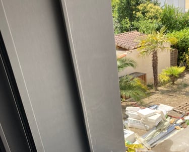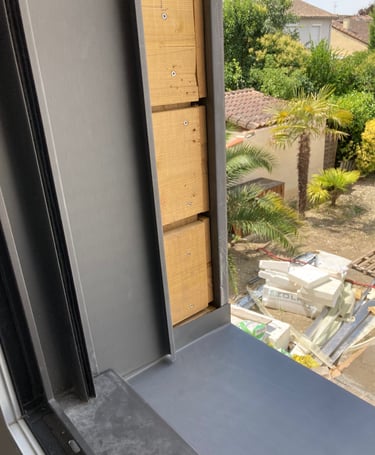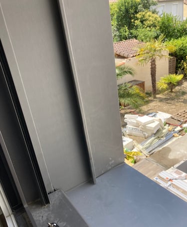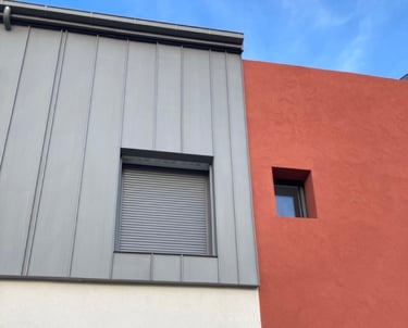 Sur ce projet de façade en joint debout en zinc Quartz, nous avons poussé jusqu'à réaliser les tableaux horizontaux et verticaux des menuiseries de la même manière. Ceci afin d'obtenir une harmonie sur toute la façade.